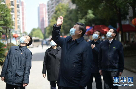 这是习近平在东湖新城社区考察时,向在家隔离居住的居民挥手致意、表示慰问。 新华社记者 谢环驰 摄
