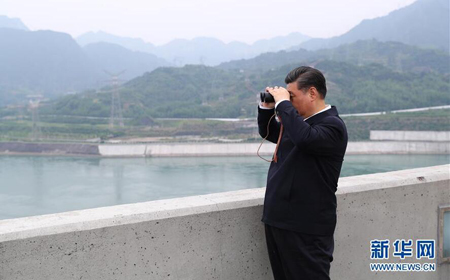 2018年4月26日下午,中共中央总书记、国家主席、中央军委主席习近平在武汉主持召开深入推动长江经济带发展座谈会并发表重要讲话。这是座谈会前,习近平于24日下午在三峡大坝坝顶察看三峡工程和坝区周边生态环境。新华社记者 谢环驰 摄
