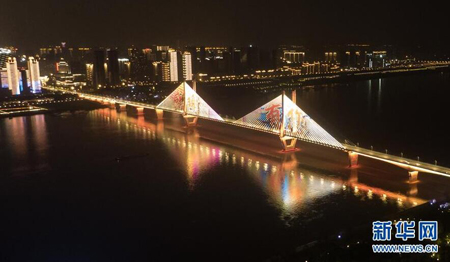 4月8日零时起,武汉市正式解除离汉离鄂通道管控措施,全市景观照明开启(无人机照片)。新华社记者 程敏 摄