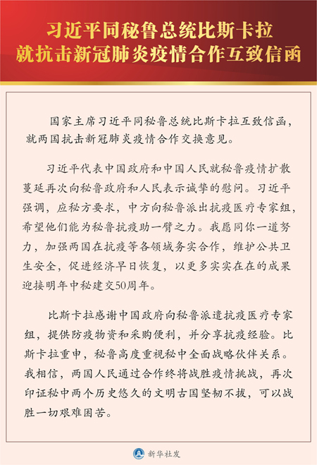 习近平代表中国政府和中国人民就秘鲁疫情扩散蔓延再次向秘鲁政府和人民表示诚挚的慰问。习近平强调,应秘方要求,中方向秘鲁派出抗疫医疗专家组,希望他们能为秘鲁抗疫助一臂之力。我愿同你一道努力,加强两国在抗疫等各领域务实合作,维护公共卫生安全,促进经济早日恢复,以更多实实在在的成果迎接明年中秘建交50周年。