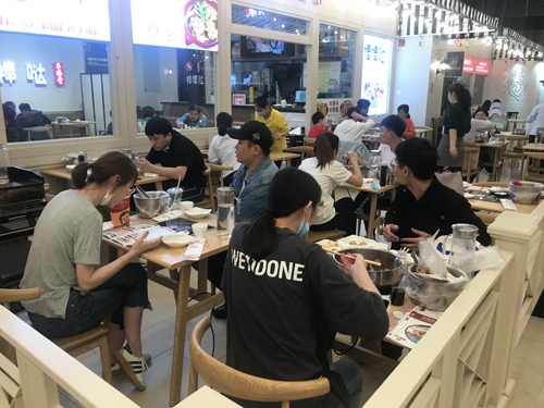 在济南万象城地下二层的美食区,各个餐饮店也均保持用餐顾客距离,同时限制用餐人数,顾客用餐的桌椅和碗筷都及时的进行消毒。