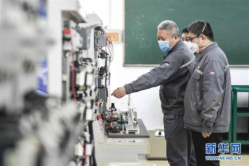 中车长春轨道客车股份有限公司首席操作师罗昭强(左一)指导工人进行高速车辆调试实训系统操作训练(4月26日摄)。新华社记者 许畅 摄