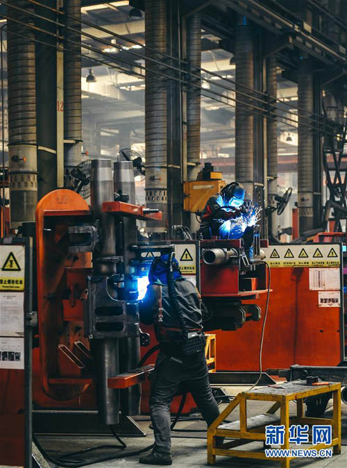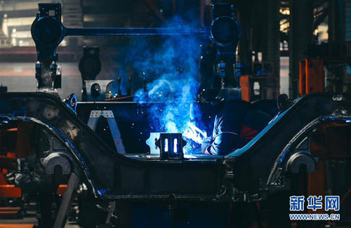 职工在中车长春轨道客车股份有限公司焊接车间内进行生产作业(4月26日摄)。新华社记者 许畅 摄