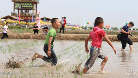 △稻渔空间举办亲子活动,游客体验捉鱼乐趣。
