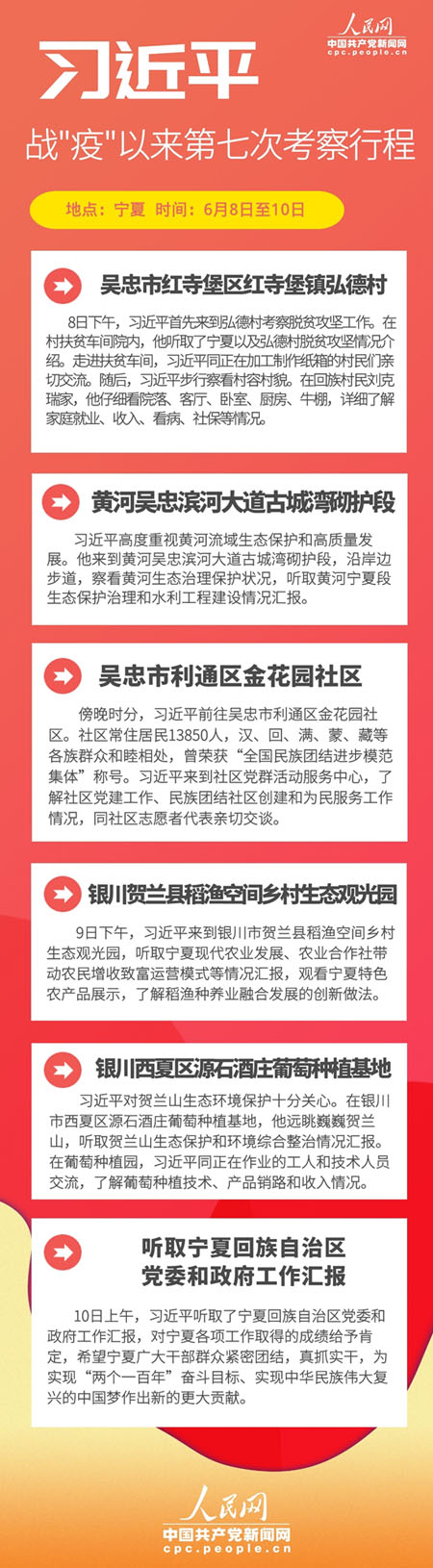 6月8日至10日,中共中央总书记、国家主席、中央军委主席习近平赴宁夏吴忠、银川等地,深入农村、社区、防洪工程、农业产业园区等,就统筹推进常态化疫情防控和经济社会发展工作、巩固脱贫攻坚成果、加强生态环境保护、推动民族团结进步进行调研。