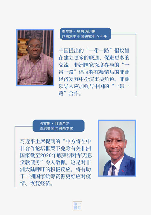 如何克服疫情给非洲国家经济发展以及中非务实合作带来的冲击?习主席指出,中非要加强共建“一带一路”合作,加快落实中非合作论坛北京峰会成果,并将合作重点向健康卫生、复工复产、改善民生领域倾斜。