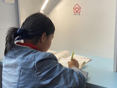 现在,她的小屋里有淡蓝色的书桌,淡蓝色的衣柜、床,还有粉红色的地面,床上是黄白条纹相间的床单和被子。她说她最喜欢房间里的书桌,桌面平整干净,书架上可以摆放很多自己喜欢的书,写作业的时候也能更专注了。小美说:“姐姐和妹妹都喜欢去我的房间,在那里学习看书。”小美第一次看到自己的小屋时,特别开心,因为害怕踩脏了干净的地面,她脱了鞋子才敢进去,现在,她一有时间就整理自己的房间,书架上的书总是摆放得整整齐齐。