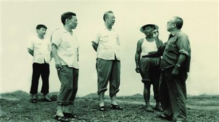 1978年8月,习仲勋(左三)在广东惠阳农村调研。在清华大学读书的习近平(左一)利用暑假时间参加社会实践,随同父亲一起下乡。(图片来源:《习仲勋画传》)