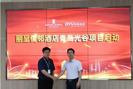 6月3日,儒邻酒店•青岛光谷项目正式启动,此项目是悦住酒店管理公司和中电光谷集团战略合作的首家门店,悦住酒店管理公司开发负责人魏国磊(右)与光谷集团项目负责人邵彬(左)共同出席启动仪式,并合影留念。