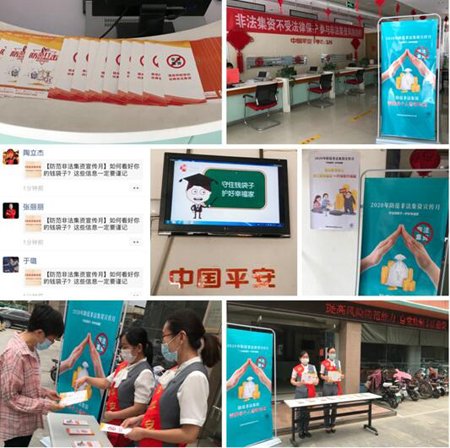宣传月期间,山东平安产险德州中支紧紧围绕银保监会部署及要求积极组织开展“守住钱袋子•护好幸福家”主题宣传工作。中支每个营业网点在醒目位置张贴防非宣传海报,持续悬挂防非条幅或播放LED标语, 在门店投放宣传资料,确保公众可随时取阅防非宣传折页。利用网络、微信、短信及6月15日面向社会公众开展防非现场咨询等宣传载体,加大宣传力度,向客户及社会各界最大限度地宣传非法集资的特点及危害,全面提升公众风险防范意识;通过内部邮件、内网专栏、培训例会等内部多种渠道,开展员工“防范和打击非法集资”专项宣传,使员工深刻认识非法集资的违法性、严重性,自觉抵制非法集资,营造公司合规氛围。