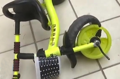 根据当时摄像头拍到的监控以及市民拍到的照片,这辆儿童车从居民楼一扇窗户中被扔出,而该位置位于走廊,并不属于居民住房内。并且该处只能打开一扇窗户,相对而言比较狭窄,儿童车是侧着从窗户里面扔了出来。这辆儿童自行车共有三个轮胎,车子砸在地上,前车轮被摔坏且变形。