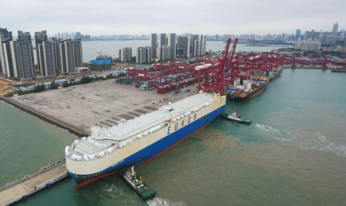 2020年2月16日,滚装货船“劳拉”轮驶入海口秀英港,这是海南自贸区政策实施以来的首艘汽车外贸船。新华社记者杨冠宇摄