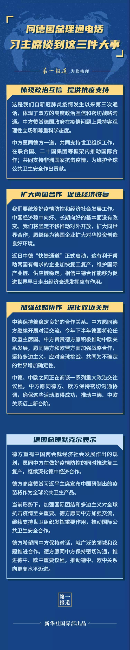 这是自新冠肺炎疫情发生以来,习主席同默克尔总理第三次通话。通话信息丰富,“第一报道”为您梳理——