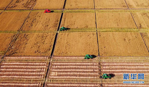 大农机在黑龙江省浓江农场收获水稻(2017年9月28日摄,无人机照片)。新华社记者 王建威 摄