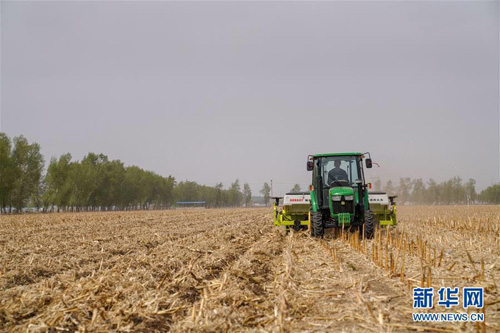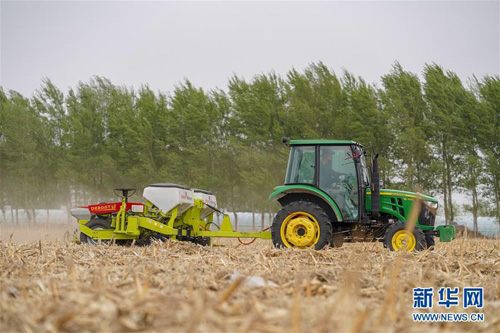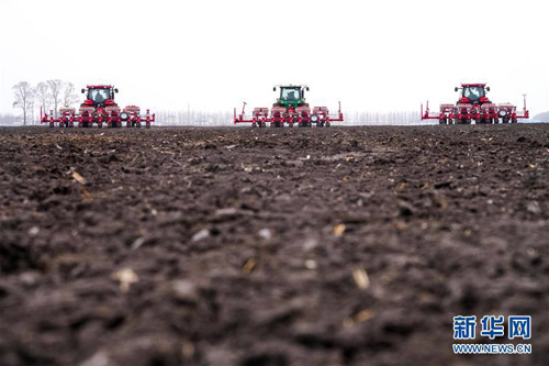 拖拉机在哈尔滨双城区进行机械化玉米播种作业(4月20日摄)。新华社记者 王松 摄