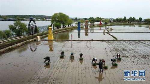 农民在黑龙江省宁安市渤海镇上官地村的稻田中插秧(5月22日摄)。新华社记者 王建威 摄