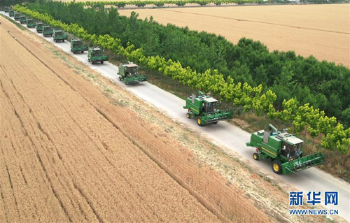在河南省黄泛区农场九分场,农机队伍准备进入麦田作业(6月2日摄,无人机照片)。新华社记者 李嘉南 摄