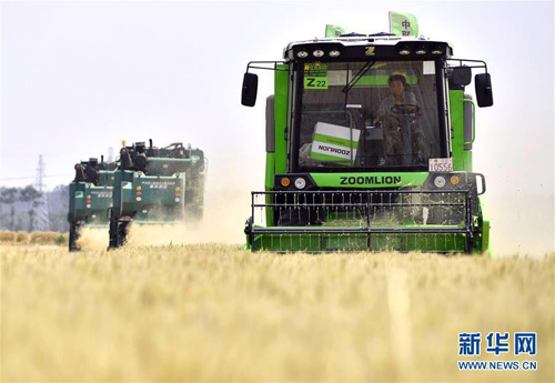 收割机在河南省西平县二郎镇张尧村的麦田中作业(5月26日摄)。新华社记者 李嘉南 摄