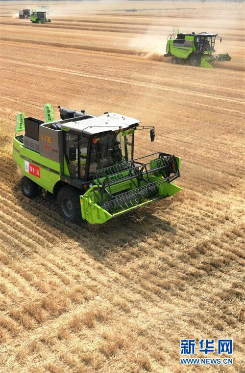 在河南省黄泛区农场九分场,收割机在麦田中作业(6月2日摄,无人机照片)。新华社记者 李嘉南 摄