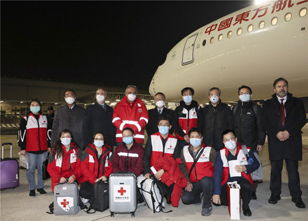 3月12日,在意大利首都罗马,意大利红十字会主席罗卡(后排右六)与中国抗疫医疗专家组一行9人合影。当天,由国家卫生健康委和中国红十字会共同组建的抗疫医疗专家组一行9人抵达罗马,并携带部分中方捐助的医疗物资。新华社记者 程婷婷 摄