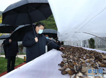 4月在陕西考察时,习近平来到柞水县小岭镇金米村考察脱贫攻坚情况。习近平步行察看村容村貌,走进村培训中心、智能联栋木耳大棚,了解木耳品种和种植流程,询问木耳价格、销路和村民收入等,夸奖他们把小木耳办成了大产业。