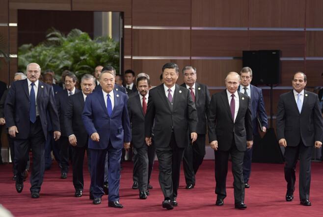 △2019年4月26日,国家主席习近平在北京出席第二届“一带一路”国际合作高峰论坛开幕式,并发表题为《齐心开创共建“一带一路”美好未来》的主旨演讲。这是习近平和出席开幕式的外方领导人共同步入会场。