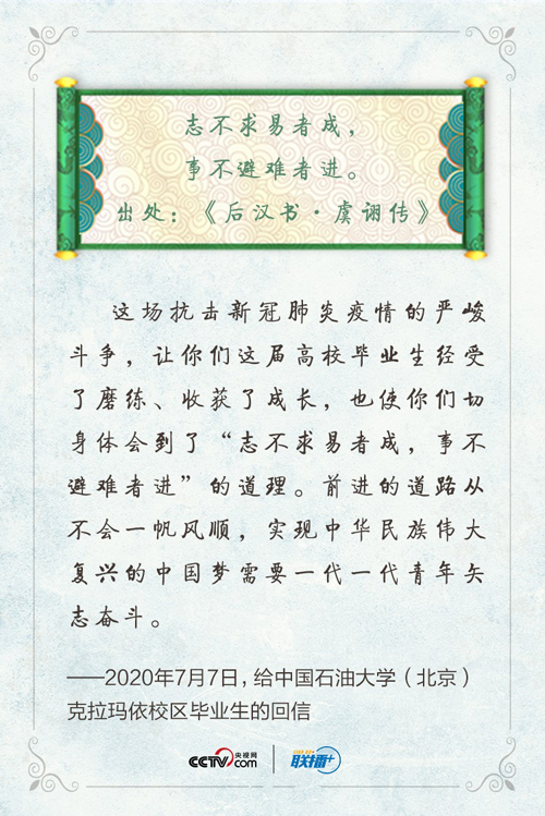 联播+ “这场抗击新冠肺炎疫情的严峻斗争,让你们这届高校毕业生经受了磨练、收获了成长,也使你们切身体会到了‘志不求易者成,事不避难者进’的道理。前进的道路从不会一帆风顺,实现中华民族伟大复兴的中国梦需要一代一代青年矢志奋斗。”