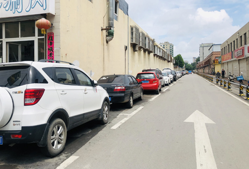 记者赶到现场时看到,孔村小区北门口是一条约400米长的小路,路南侧是沿街商铺,北侧地面上东西方向则用白线画有停车位,一路依次停放着几十辆车。记者自西向东沿路看下去,除了上午已经驶离的个别车辆外,停放在停车位上的车辆几乎全部左前轮车胎是瘪的。
