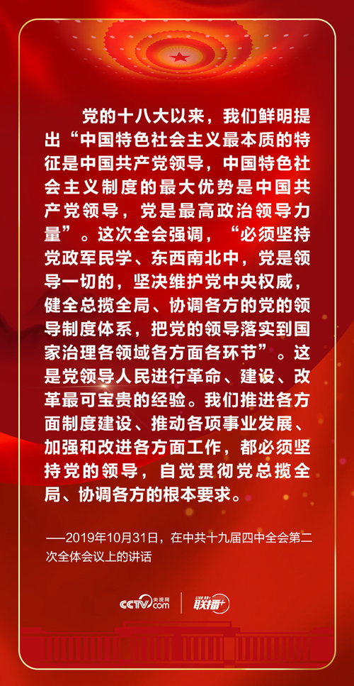 联播+ 中国共产党领导是中国特色社会主义最本质的特征,中国共产党是国家最高政治领导力量,是实现中华民族伟大复兴的根本保证。在国家治理体系的大棋局中,党中央是坐镇中军帐的“帅”,车马炮各展其长,一盘棋大局分明。
