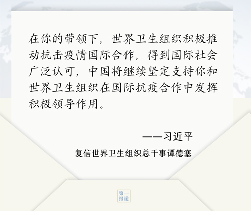 在给世界卫生组织总干事谭德塞的复信中,习主席特别表达对世卫组织在国际抗疫合作中发挥领导作用的坚定支持: