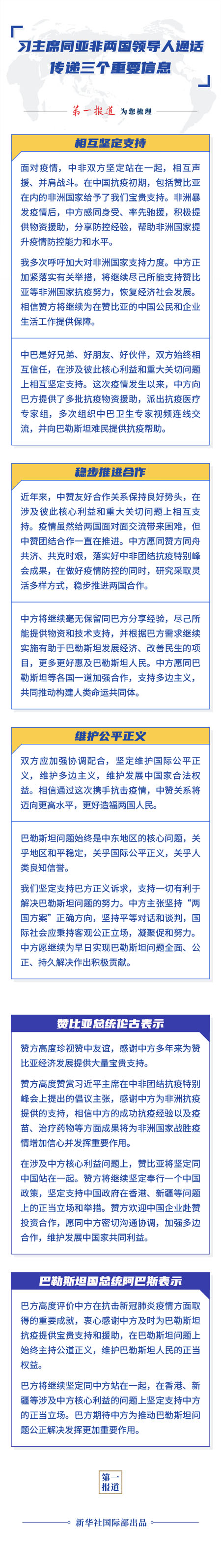 习近平强调,近年来,中赞友好合作关系保持良好势头,在涉及彼此核心利益和重大关切问题上相互支持。疫情虽然给两国面对面交流带来困难,但中赞团结合作一直在推进。中方愿同赞方同舟共济、共克时艰,落实好中非团结抗疫特别峰会成果,在做好疫情防控的同时,研究采取灵活多样方式,稳步推进两国合作。双方应加强协调配合,坚定维护国际公平正义,维护多边主义,维护发展中国家合法权益。相信通过这次携手抗击疫情,中赞关系将迈向更高水平,更好造福两国人民。