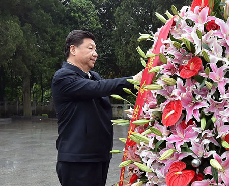 习近平在安徽考察期间,来到金寨县红军广场向革命烈士敬献花篮(新华社记者李涛 摄)