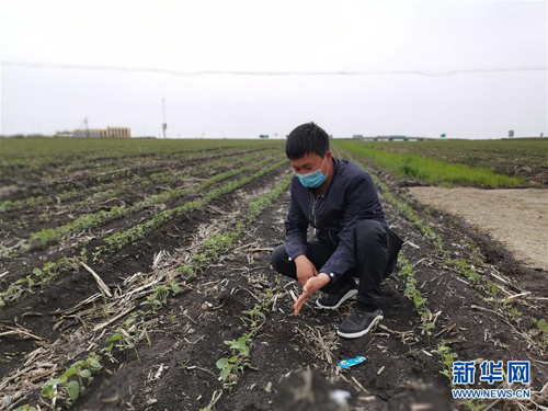 黑龙江省海伦市自新农机农民专业合作社理事长付正武查看土壤情况(6月9日摄)。 新华社记者 王建 摄