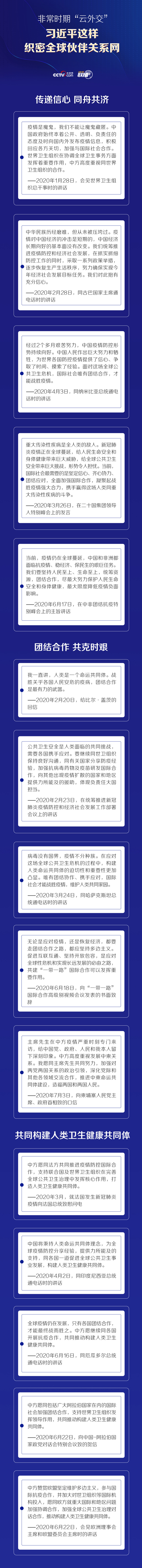 截至目前,习主席就疫情开展的“电话外交”已达60余次,出席二十国集团领导人应对新冠肺炎特别峰会,在第73届世界卫生大会视频会议开幕式上致辞,主持中非团结抗疫特别峰会并发表主旨讲话,不断向全球表明中国支持团结抗疫的鲜明立场。