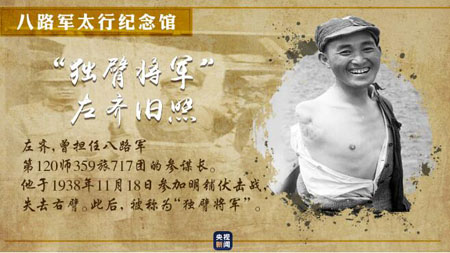 一张独臂将军的旧照,展现出八路军为争取民族独立,不怕牺牲、不畏艰险的革命英雄主义精神。
