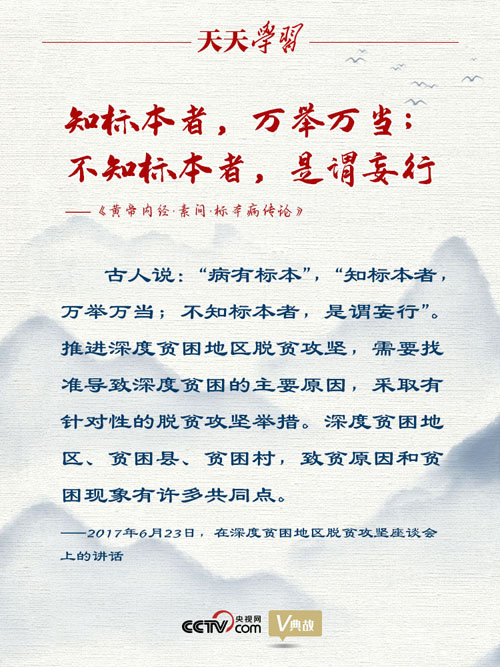 2017年6月23日,习近平总书记主持召开深度贫困地区脱贫攻坚座谈会并发表重要讲话。他在讲话中引用古语“病有标本”“知标本者,万举万当;不知标本者,是谓妄行”,指出深度贫困地区、贫困县、贫困村,致贫原因和贫困现象有许多共同点。推进深度贫困地区脱贫攻坚,需要找准导致深度贫困的主要原因,采取有针对性的脱贫攻坚举措。