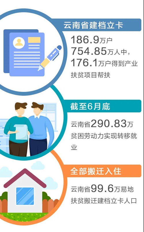 为进一步强化易地扶贫搬迁后续扶持,云南省加快完成配套设施建设,积极完成剩余搬迁任务,抓紧拆旧和复垦复绿等工作,千方百计做好搬迁安置区的产业发展、就业帮扶、就学就医、社区治理等工作,确保做到稳得住、有就业、逐步能致富。截至6月底,全省99.6万名易地扶贫搬迁建档立卡贫困人口已全部搬迁入住,完成了云南历史上规模最大、涉及面最广、效益最优的“挪穷窝、换穷业”行动。出台《云南省易地扶贫搬迁“稳得住”工作方案》,提出“稳得住”40条保障措施,计划用5年时间通过提升服务效能、完善功能配套、保障就医就学、加强产业就业、强化综合治理等方面,持续做好稳得住、可发展、能致富、保权益、促融合“5篇文章”。