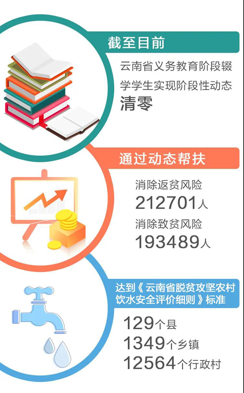 聚焦“三保障”和饮水安全。脱贫攻坚百日总攻行动中,云南省扎实开展春季学期控辍保学专项行动;组织开展县乡村医疗卫生机构达标验收并建立达标动态管理销号机制;按照“安全稳固,遮风避雨”标准要求,聚焦建档立卡贫困户住房安全。截至目前,全省义务教育阶段辍学学生实现阶段性动态清零;88个贫困县县乡村三级医疗卫生机构全部达到云南省贫困退出标准和脱贫成果巩固基本标准要求;全省129个县(市、区)、1349个乡镇、12564个行政村全部达到《云南省脱贫攻坚农村饮水安全评价细则》标准。2017年以来,全省农危改共解决超过130万户500万名贫困群众住房安全问题,其中,今年3月底前动态新增的4类重点对象危房户4026户均已完成改造。