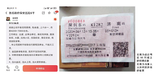 王先生说,今年4月份,他去深圳打工,做保安工作,但公司不给交社保,所以他想换一家公司就职。通过58同城,王先生看到一条招聘广告,大致内容是,一家名为“中军军弘保安服务有限公司济南分公司”的公司,招聘保安,“工资挺好,还给交社保。”