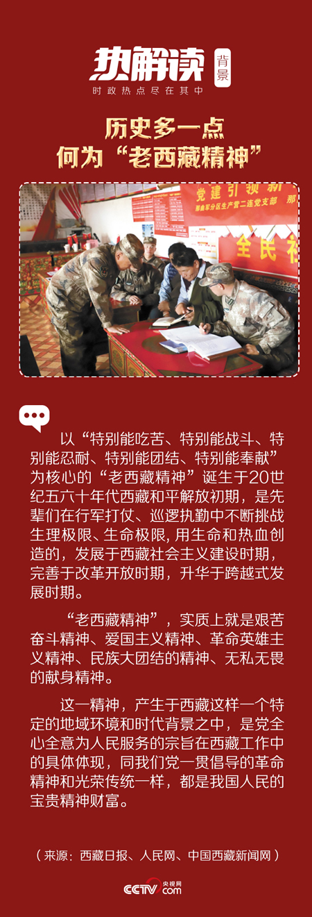 那些背着背包以双脚征服14座海拔5000多米险峻雪山的中国人民解放军将士,用军魂熔铸“老西藏精神”;写出“冰山愈冷情愈热,耿耿忠心照雪山”诗句的援藏干部孔繁森,用生命践行“老西藏精神”;滔滔江河上搭金桥、重重险山间辟大道,迢迢天路无言诉说着“老西藏精神”;“玉麦每一个人都是祖国的坐标”,在西藏长达4000多公里的边境线上,数不清的党员干部默默践行传承着“老西藏精神”……