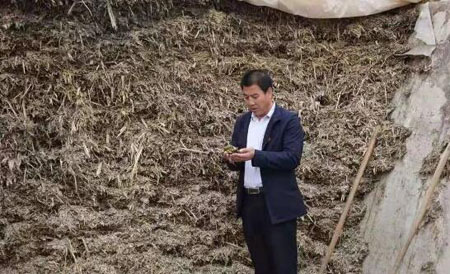 ▲宁夏固原市西吉县庞湾村第一书记高士平查看青贮池腌草情况。