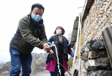 ▲甘肃省甘南藏族自治州舟曲县果耶镇勒阿村第一书记张金利在村民家检查自来水管。