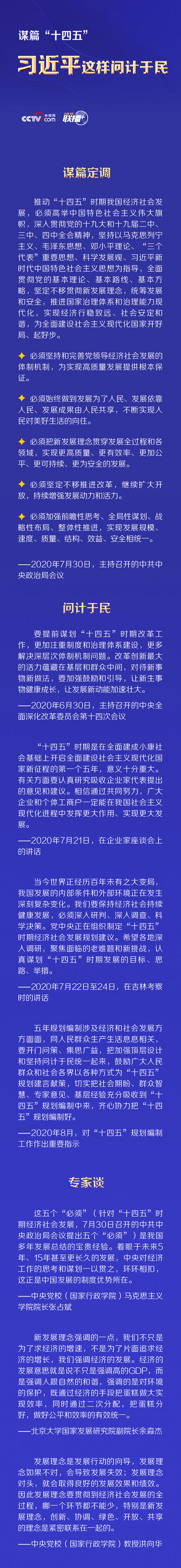 今年以来,习近平总书记多次主持召开重要会议、赴地方考察,就“十四五”开门问策,听取大家对当前经济形势、“十四五”规划的意见和建议,指引大家把“十四五”规划编制好。央视网《联播+》特梳理相关内容,与您一同学习。