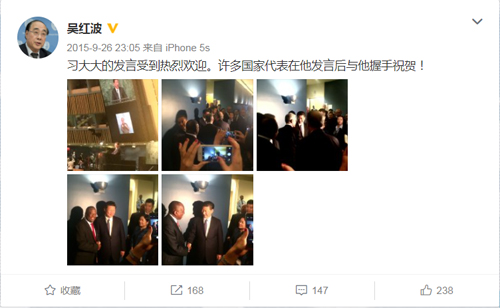 时任联合国副秘书长吴红波说,习主席走下讲台时,二三十位其他国家领导人排队与他握手表示祝贺,走廊里挤得满满当当。