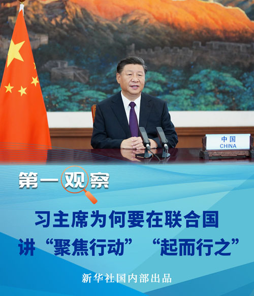 21日,在联合国成立75周年纪念峰会上,习近平主席就联合国如何发挥作用提出四点建议,其中点出“聚焦行动”这一关键词,强调“不能只开药方,不见疗效”。