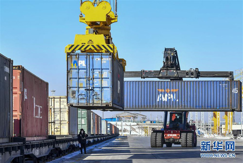 工人在中欧班列乌鲁木齐集结中心吊运货物(3月12日摄)。 新华社记者 王菲 摄