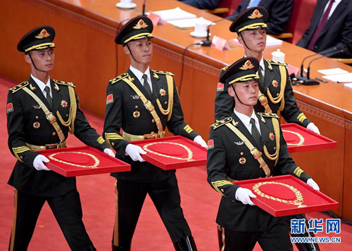 6名号手吹响仪式号角,4名礼兵手捧共和国勋章、国家荣誉称号奖章正步走上主席台,铿锵的步伐在人民大会堂大礼堂内久久回荡。中华人民共和国国家勋章和国家荣誉称号颁授仪式开始了。