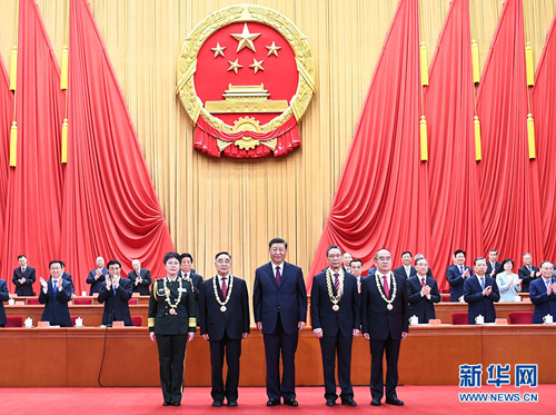 9月8日,全国抗击新冠肺炎疫情表彰大会在北京人民大会堂隆重举行。中共中央总书记、国家主席、中央军委主席习近平向“共和国勋章”获得者钟南山(前排右二),“人民英雄”国家荣誉称号获得者张伯礼(前排左二)、张定宇(前排右一)、陈薇(前排左一)颁授勋章奖章。 新华社记者 谢环驰 摄