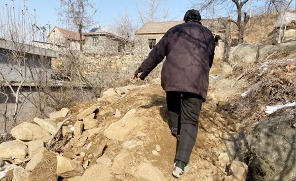 见到李中随时,他正在院子里拿着铁锹忙活着,要不是有村民指引很难找到他家。1月6日,临沂的气温将近零下二十度,尽管是中午头,山里的风吹在脸上也冻得生疼。“忙活了一上午,身上都有点出汗了。”李中随戴着帽子,穿着一双单鞋在院子里填土。这是一个没有院墙的院子,大门两侧由简单的石块砌着,只有半截。院子中央有一棵只剩枯枝的老树,其他东西在这个院子里并不是很显眼。