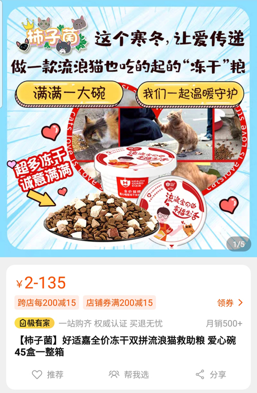 国内宠物行业进入了加速发展期,作为国内宠物行业首家上市公司,佩蒂股份(300673.SZ)近日发起的流浪动物公益救助活动引起了广泛关注。本次活动,佩蒂股份推出了一款为流浪猫设计的 “爱心”猫粮,正在电商平台进行推广及售卖,但因“爱心”猫粮价格核算下来远高于普通猫粮,有消费者质疑此举是以公益之名行营销之实。 ◎山东商报·速豹新闻网记者 李雨馨